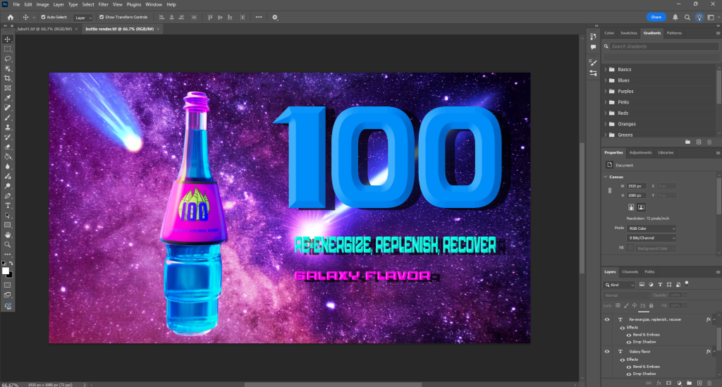 Project Description: I made a product ad for a sports drink by modeling and rending the bottle and liquid on Maya and then taking it to Photoshop. The product ad was for a all-natural sports drink under the brand “100.” I gave the ad a space twist.