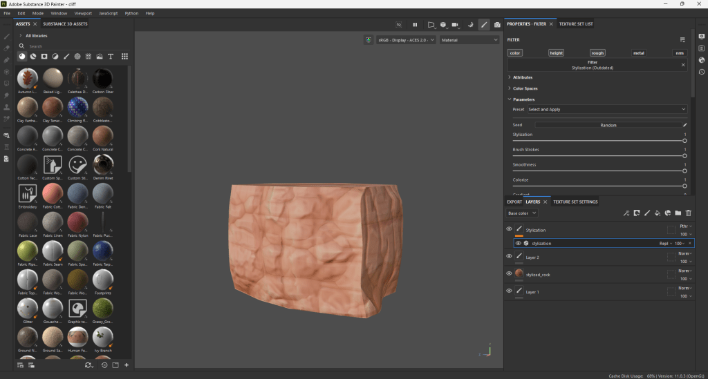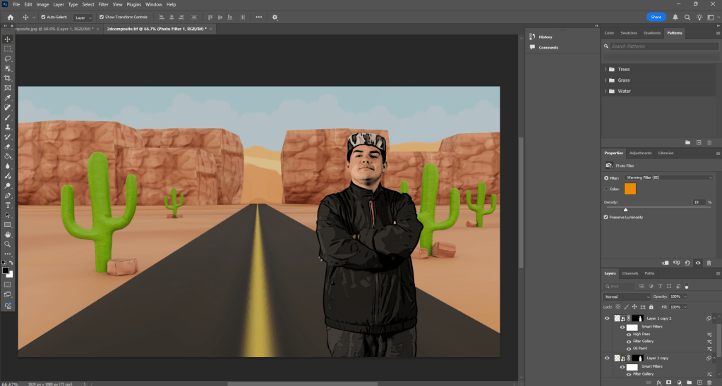 Project Description: I modeled a desert environment in Maya and then textured the models with a toon shader in Substance Painter. I then composited it with a 2d filtered photo of myself in Photoshop.